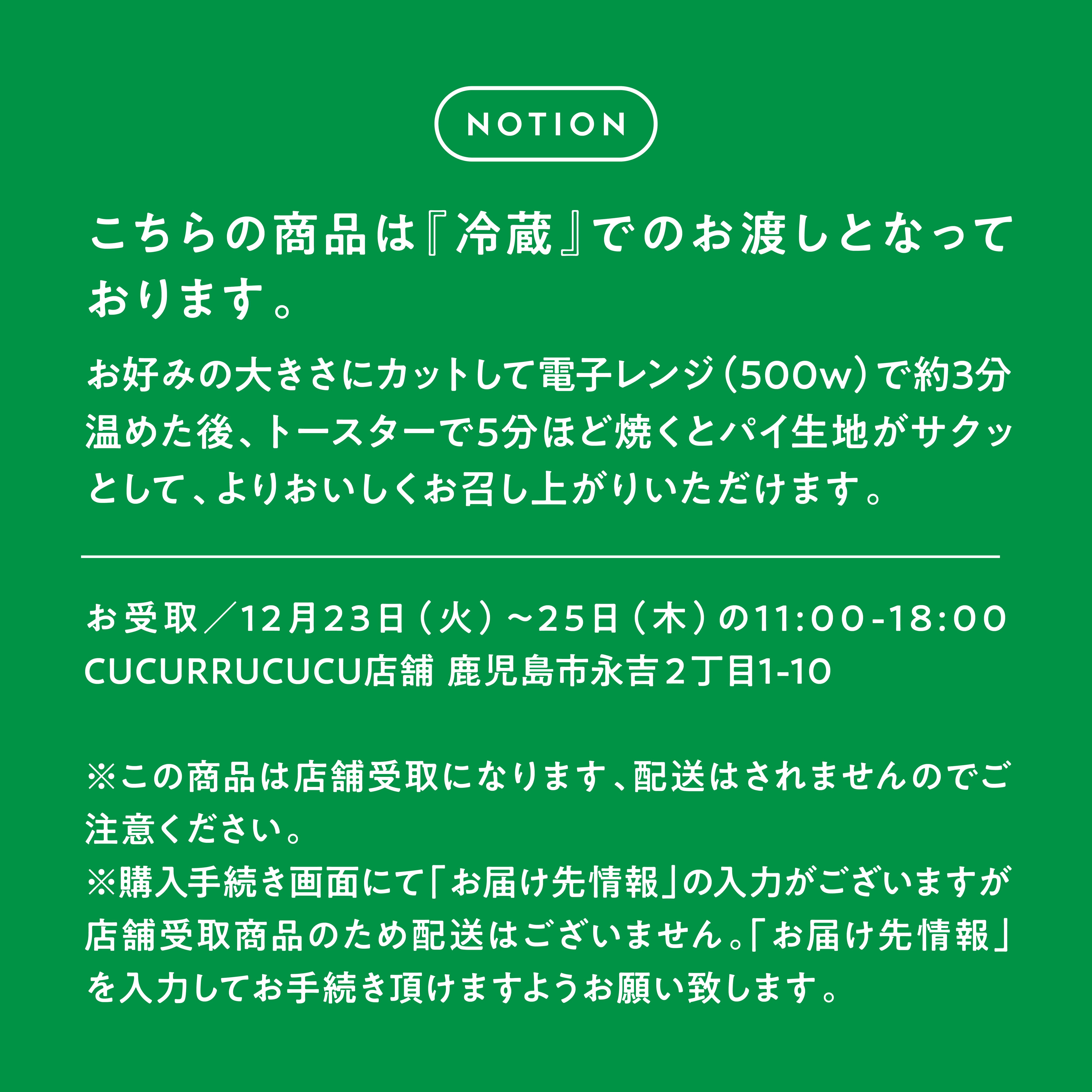 冷蔵庫で半日〜1晩冷蔵解凍後、アルミ皿を外し耐熱皿に移し替えて電子レンジ(500w)で3分温め、トースターで5分ほど焼くとパイ生地がサクッとして、よりおいしくお召し上がりいただけます。